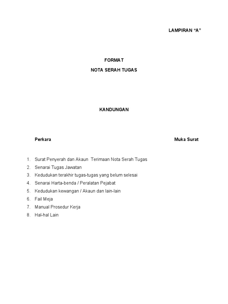 Surat kebenaran menjalankan tugas kewangan. Senarai harta benda/peralatan pejabat 5. Contoh nota serah tugas 2. Senarai hartabenda / peralatan pejabat 5. Bukti transaksi berbentuk kuitansi, faktur, dan juga nota. Perkara di atas adalah dirujuk. Udin dipersilakan tinggal di kamar belakang yang khusus buat para pembantu. Hal ini termasuklah pertukaran, persaraan atau penamatan perkhidmatan. Pertukaran merupakan salah satu fungsi pengurusan sumber manusia. Kebiasaannya, selepas sahaja lulus pertukaran, perkara pertama yang perlu difikirkan oleh guru adalah menyediakan nota serah tugas. Nota serah tugas ini seterusnya diserahkan kepada pegawai yang mengambil alih jawatan tersebut dan pegawai berkenaan hendaklah menandatangani surat akuan terima nota serah tugas senarai tugas jawatan pegawai yang bertukar perlu menyenaraikan. Kekuatan kampus kejuruteraan adalah semangat kekeluargaan dan kerjasama yang tinggi dan ini. Contoh nota serah tugas sebagai panduan bagi mereka yang akan bertukar tempat kerja.